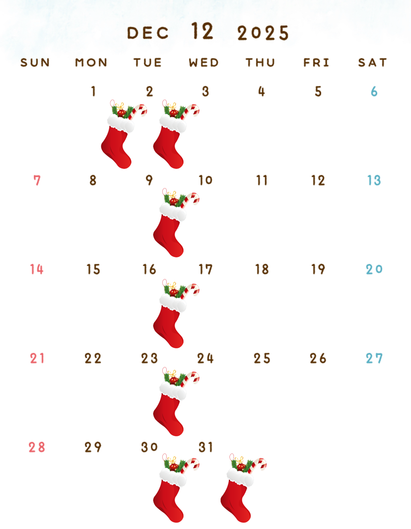 12月の休み 毎週火曜日 1(月)31(水)